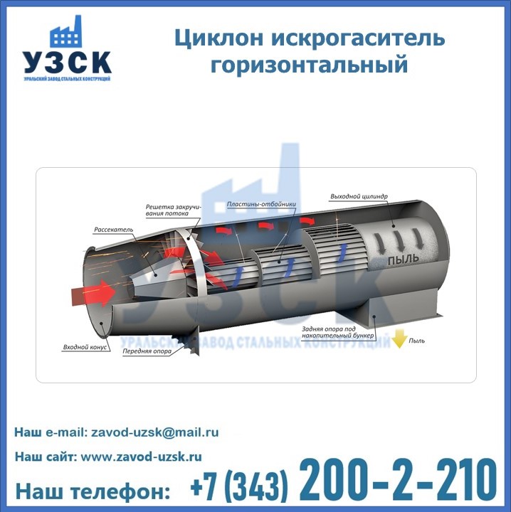 Горизонтальные циклоны-искрогасители ЦГ поставляются в Первоуральске в сборке или же транспортными единицами для последующей сборки, если предназначены для работы с большими объемами.