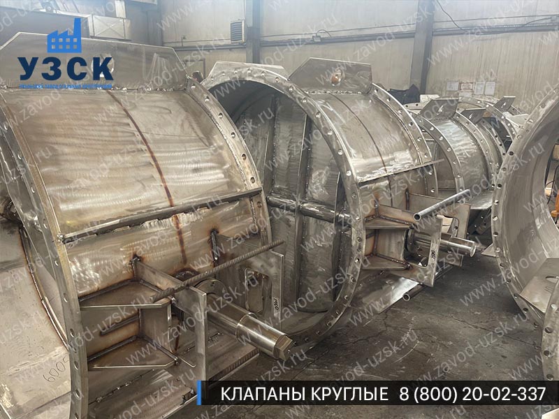 Круглый клапан ПГВУ представляет собой участок трубы, оборудованный изнутри створками. Шибер ПГВУ повторяет геометрию прохода. Для изготовления круглых газоплотных клапанов используются устойчивые к коррозиям и температурным воздействиям материалы (нержавеющая сталь, низколегированная сталь с АКП).